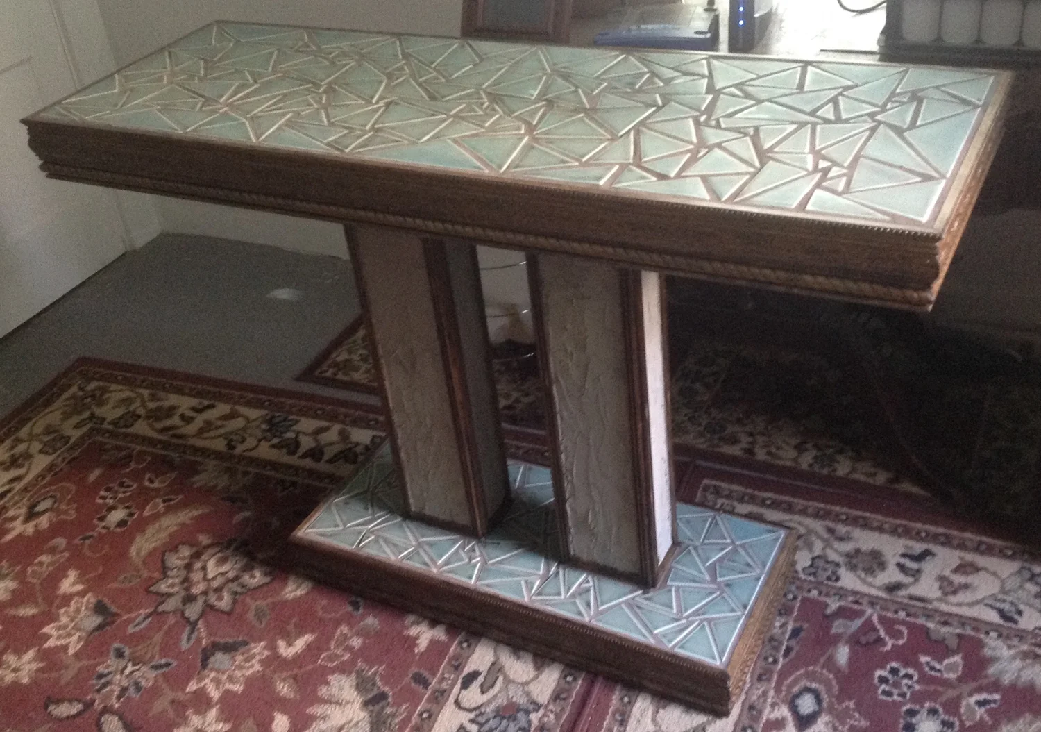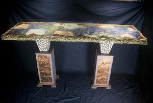 Beautiful solid ceramic stoneware top, singlfired, white porcelain tile over substructure, terra cotta uprights with faux tortoise shell surface treatment.  Apx. 7 feet long and 4 feet tall.